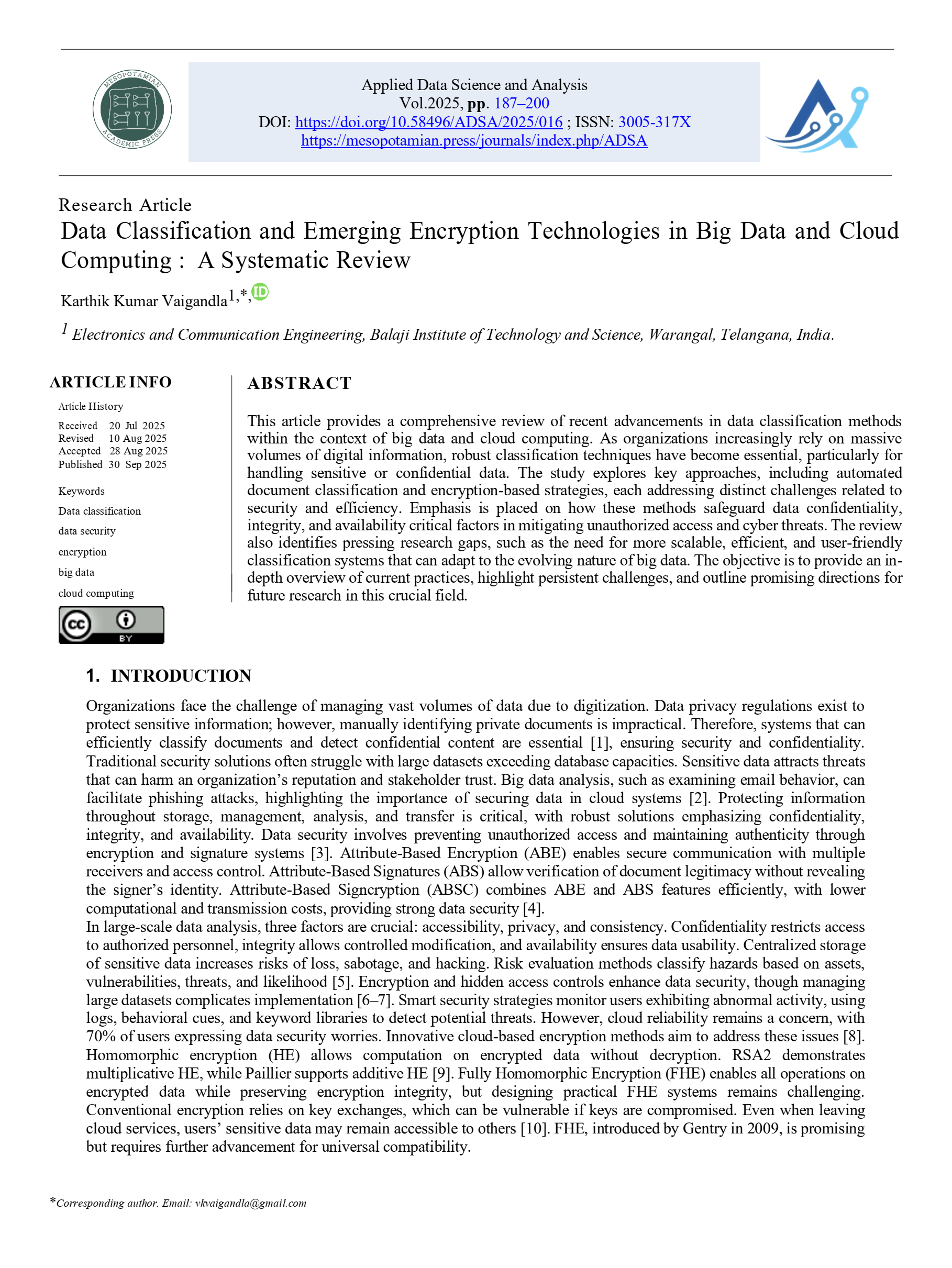 This article provides a comprehensive review of recent advancements in data classification methods within the context of big data and cloud computing. As organizations increasingly rely on massive volumes of digital information, robust classification techniques have become essential, particularly for handling sensitive or confidential data. The study explores key approaches, including automated document classification and encryption-based strategies, each addressing distinct challenges related to security and efficiency. Emphasis is placed on how these methods safeguard data confidentiality, integrity, and availability critical factors in mitigating unauthorized access and cyber threats. The review also identifies pressing research gaps, such as the need for more scalable, efficient, and user-friendly classification systems that can adapt to the evolving nature of big data. The objective is to provide an in-depth overview of current practices, highlight persistent challenges, and outline promising directions for future research in this crucial field.