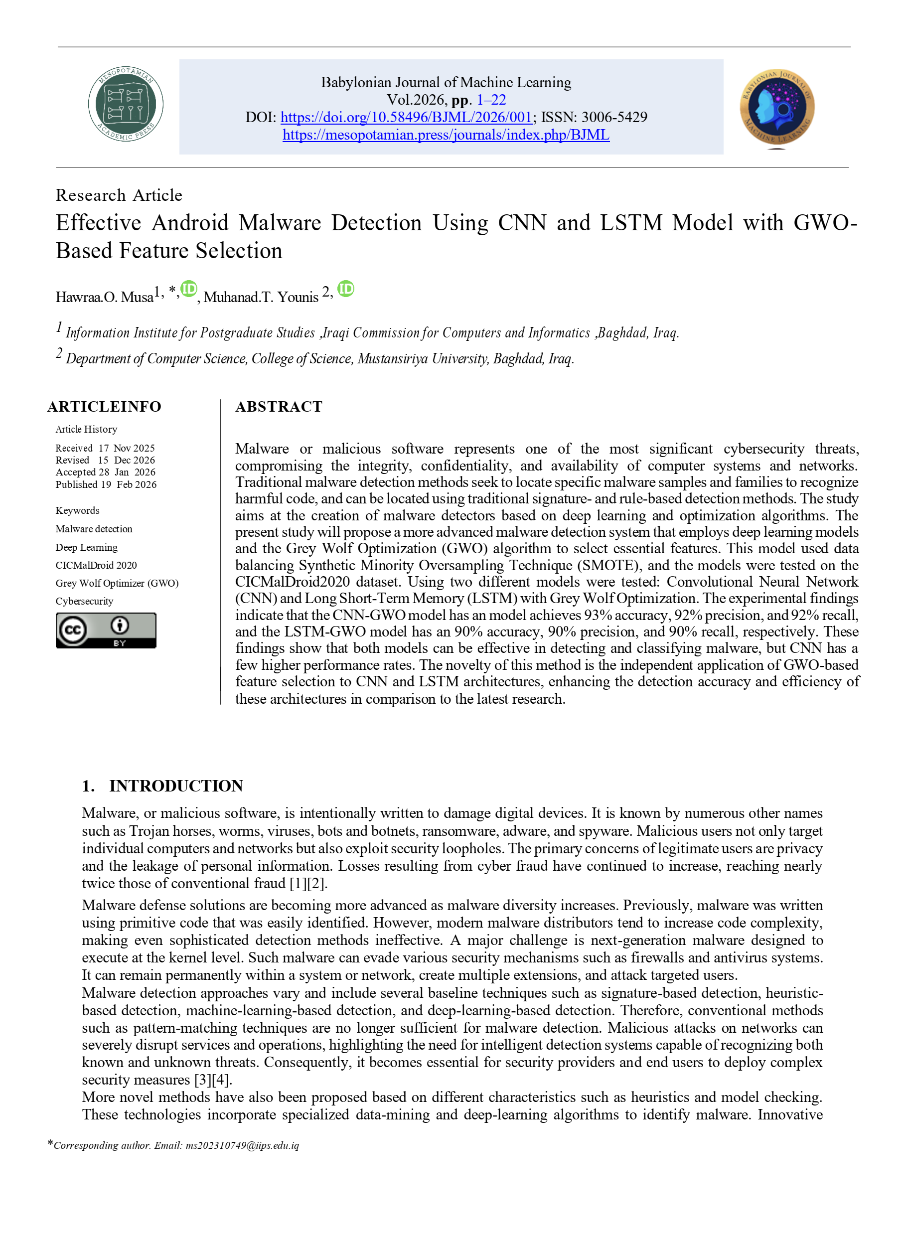 Effective Android Malware Detection Using CNN and LSTM Model with GWO-Based Feature Selection