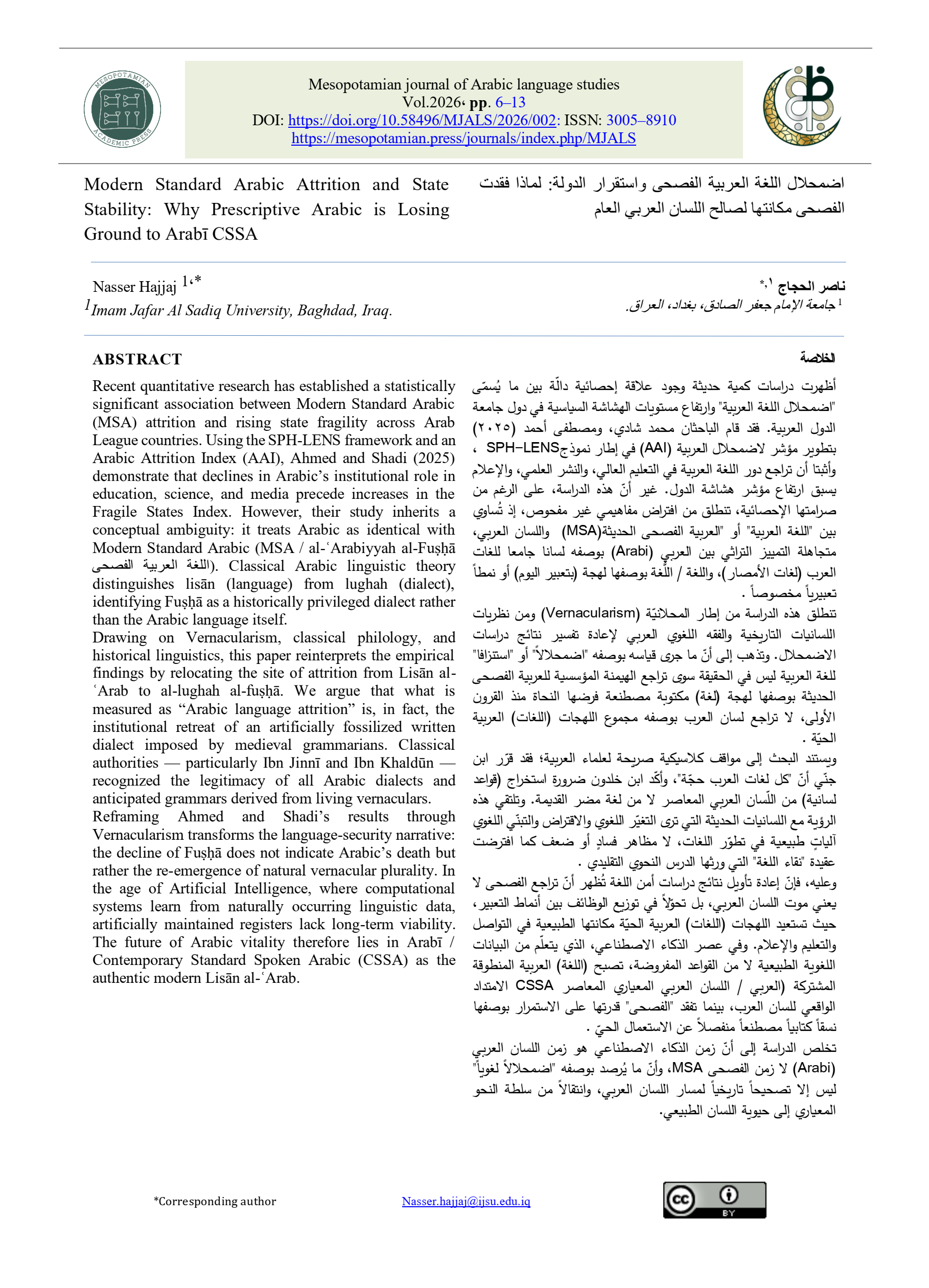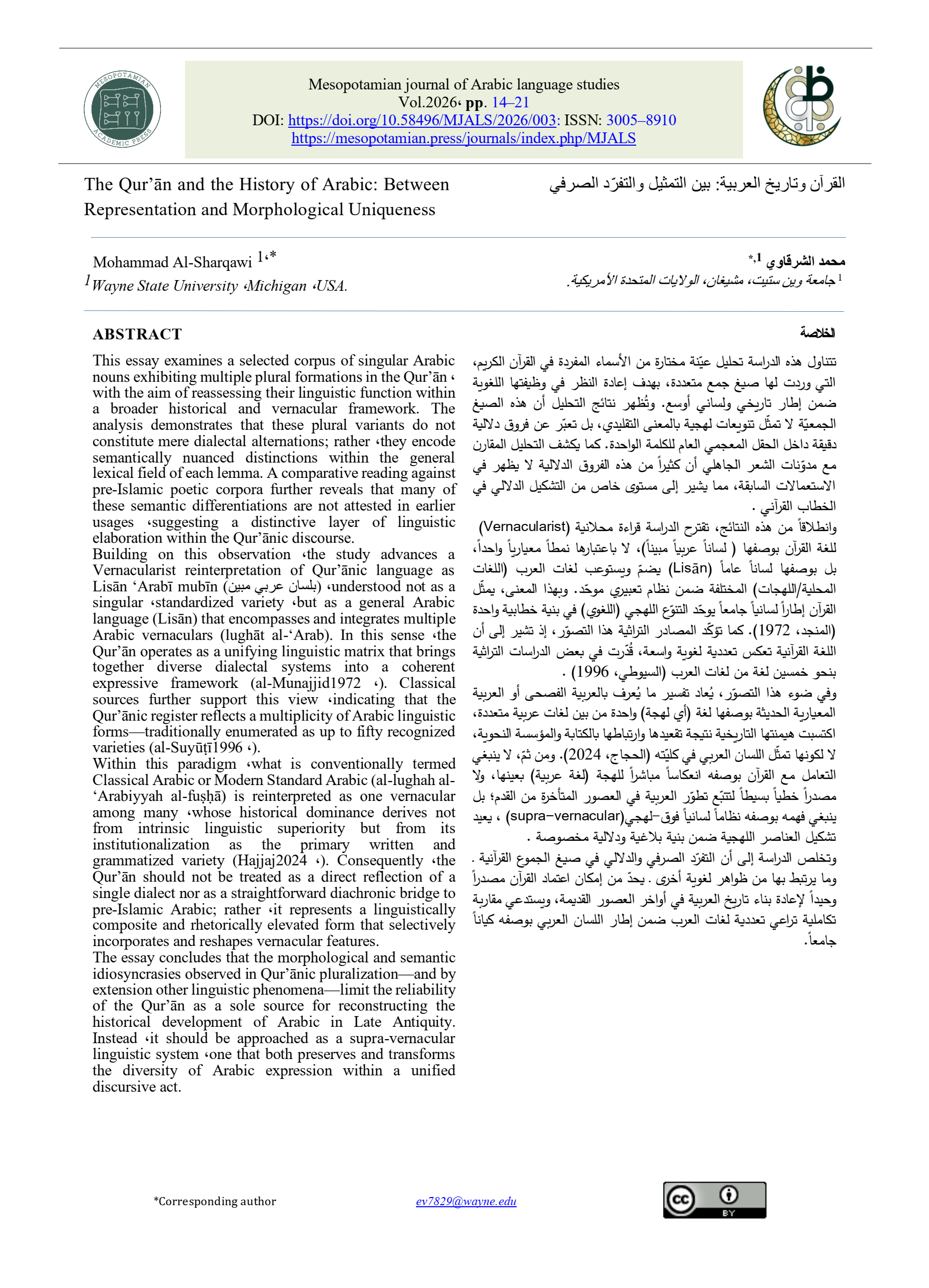 Welcome scholars and researchers in Arabic language studies! The Mesopotamian Journal of Arabic Language Studies has launched, inviting your valuable contributions. Join our scholarly community dedicated to advancing knowledge in Arabic linguistics, literature, and culture. Your impactful research and insights will shape the field's discourse. With rigorous peer-review, we ensure excellence. Submit your work and engage in dialogue with us at the Mesopotamian Journal of Arabic Language Studies