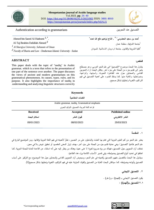 Authentication according to grammarians (A. bin S. Al-Hadrami & A.-T. I. D. Ahmed , Trans.). (2023). Mesopotamian Journal of Arabic Language Studies, 2023, 24-40. https://doi.org/10.58496/MJALS/2023/003