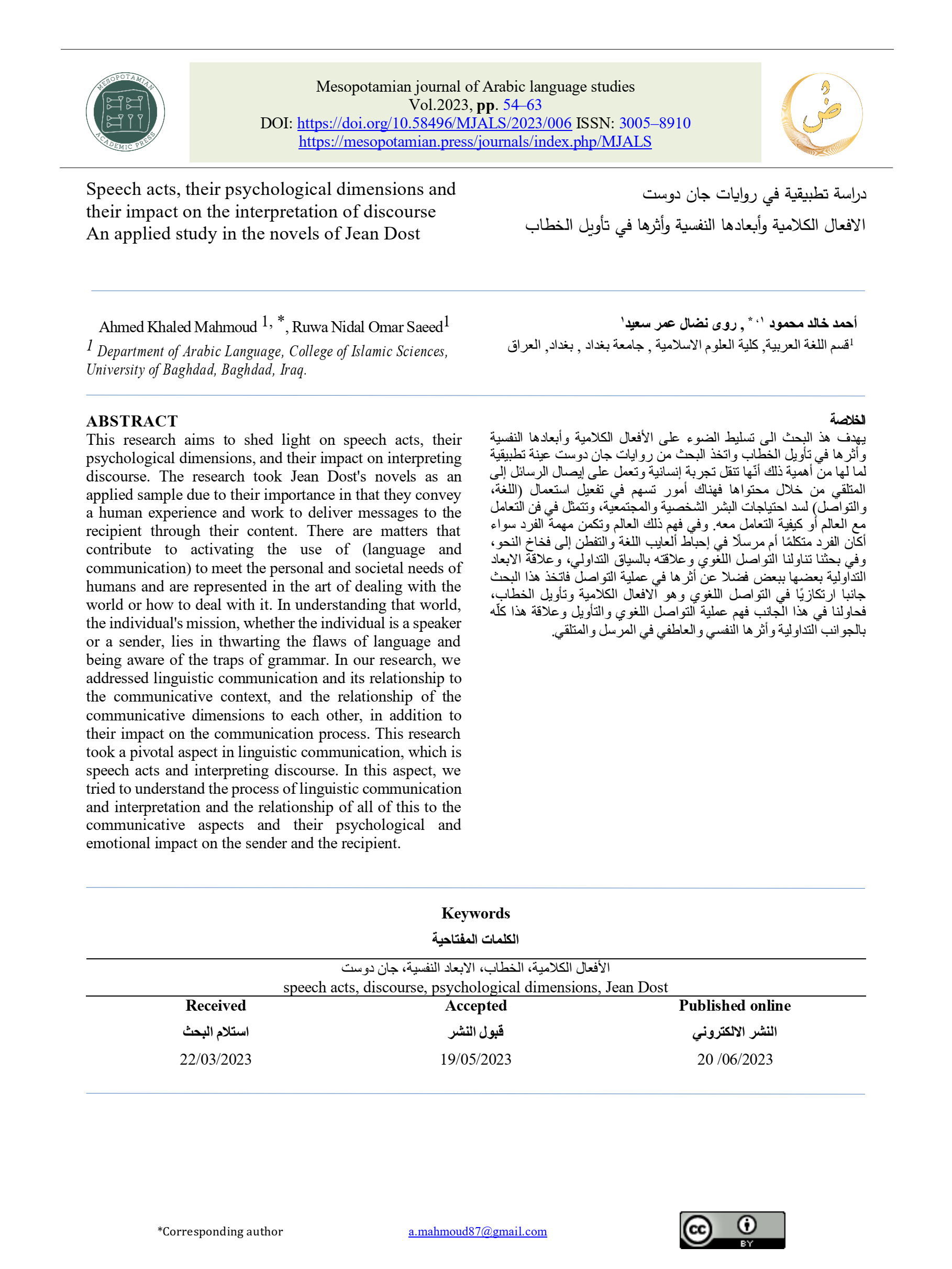 Speech acts, their psychological dimensions and their impact on the interpretation of discourse An applied study in the novels of Jean Dost